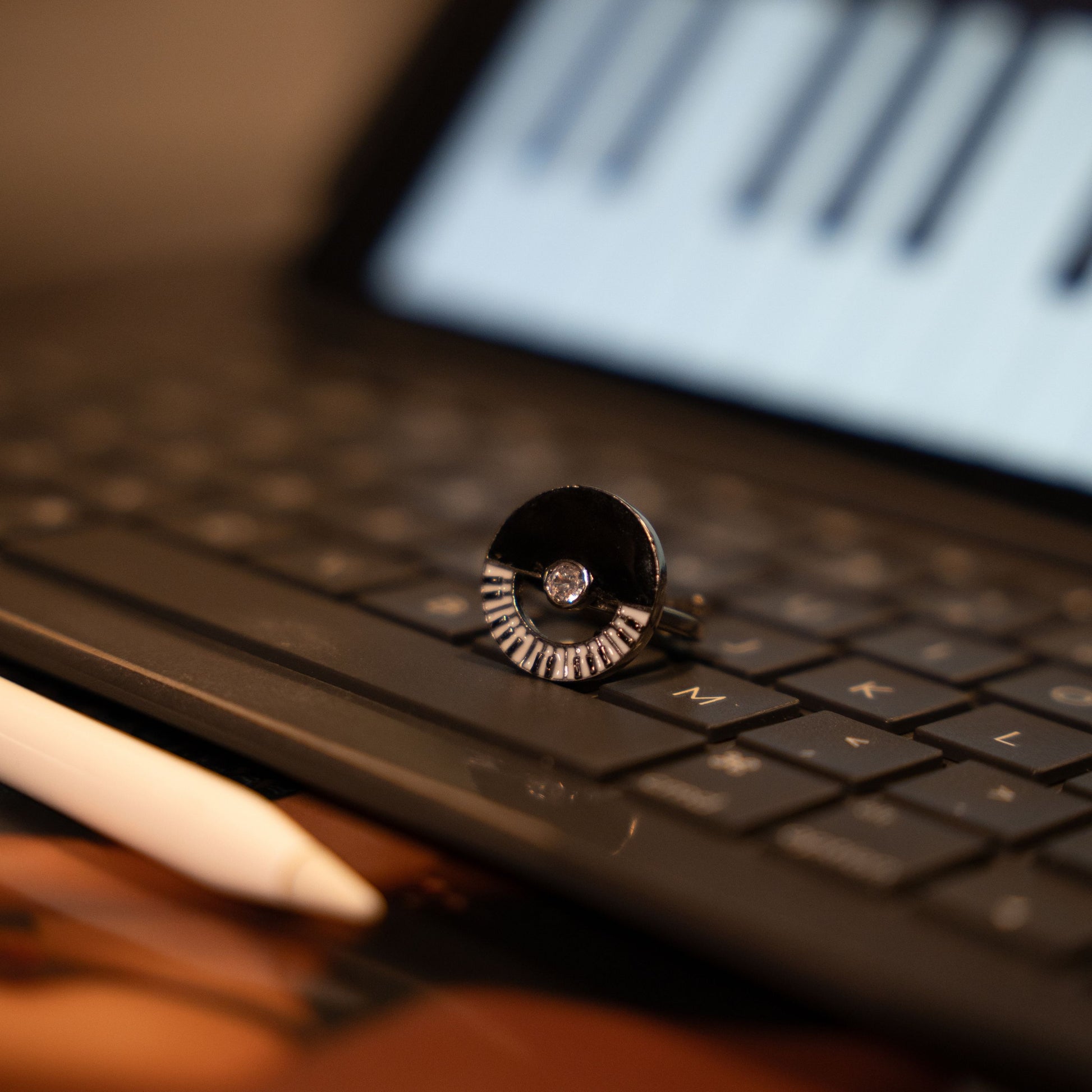 Ring highlighting Hand‑enameled black and white piano keys in a sleek, open geometric design sparkle with stone at the center, adding subtle shine without overwhelming the design.